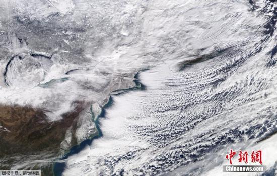 美国国家航空航天局(NASA)于2018年1月6日发布的一幅卫星图,图为拍摄到的一场席卷安大略湖、东部和美国东北部的冬季暴风雪。