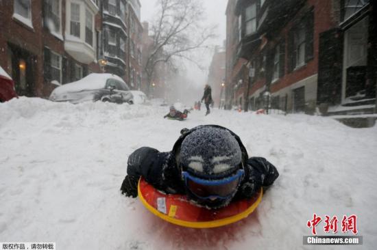 虽然这场暴风雪给美国大部分地区的交通造成了严重影响,但同时也为孩子们创造了天然的滑雪场。不用面临上班出行的痛苦,享受到学校停课的福利,出门就能滑雪的乐趣让小朋友不惧严寒。图为市区一群孩子在街道上驾驶滑板前行。